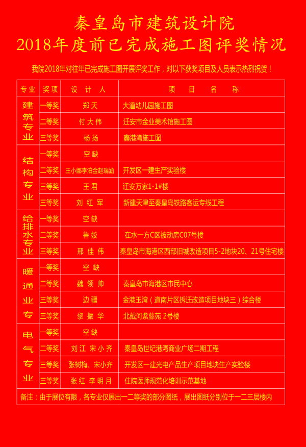 截止到2018年3月5日,活動最終按照各專業(yè)分別評選出了一、二、三等獎,評選結(jié)果和獲獎的優(yōu)秀施工圖分別在大堂進行了公示。
